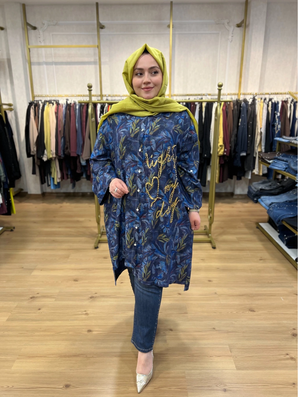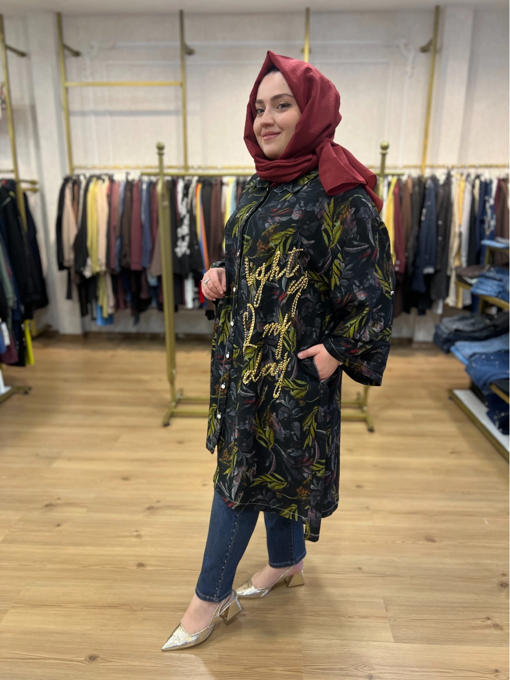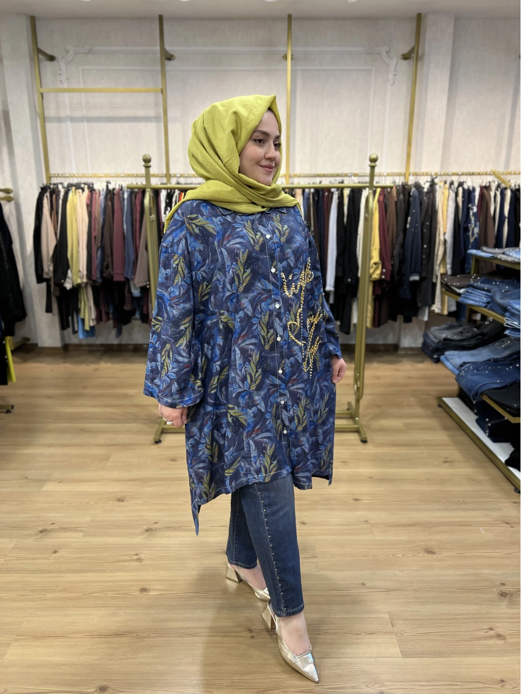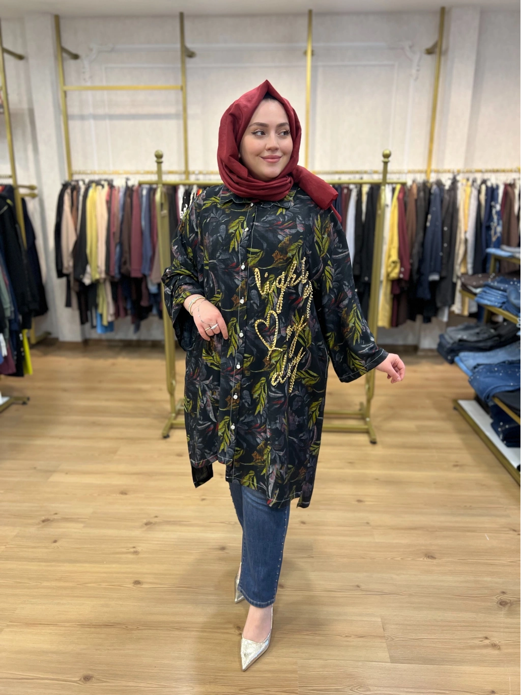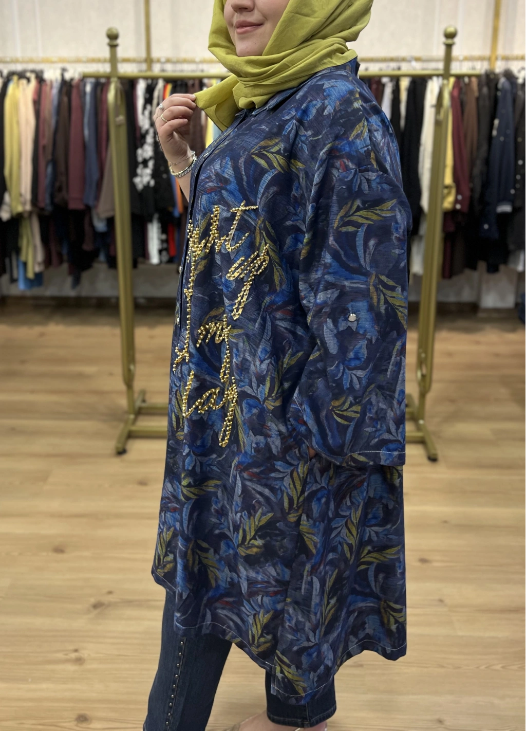 İTHAL BÜYÜK BEDEN Gold Zımba ve Yazılı Pamuk Gömlek