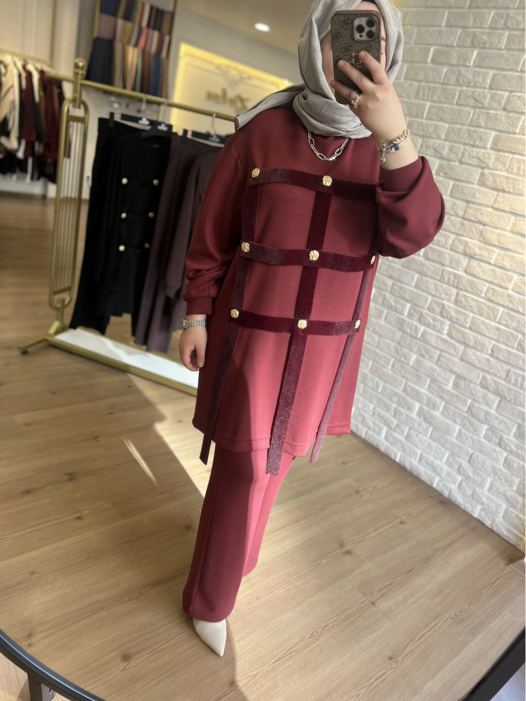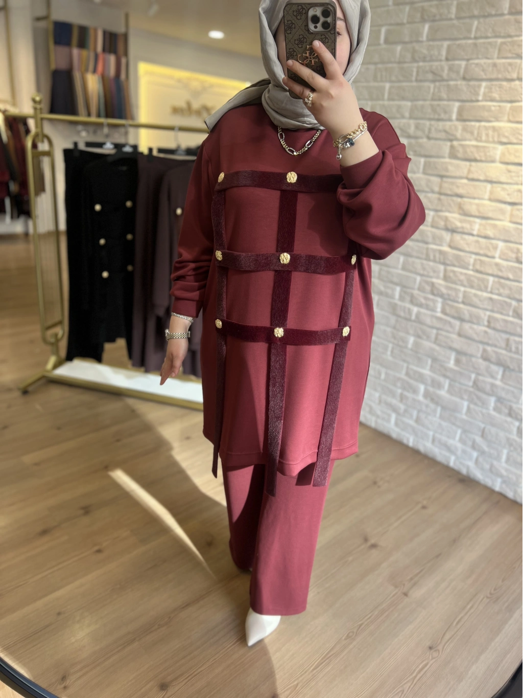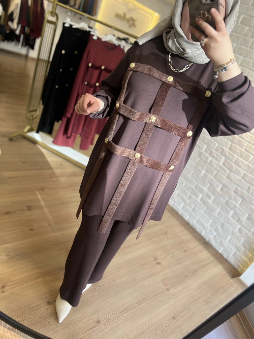 Pureva İncili Deri Detaylı Angora Yelekli Üçlü Takım