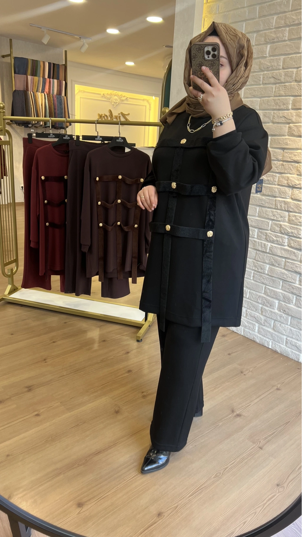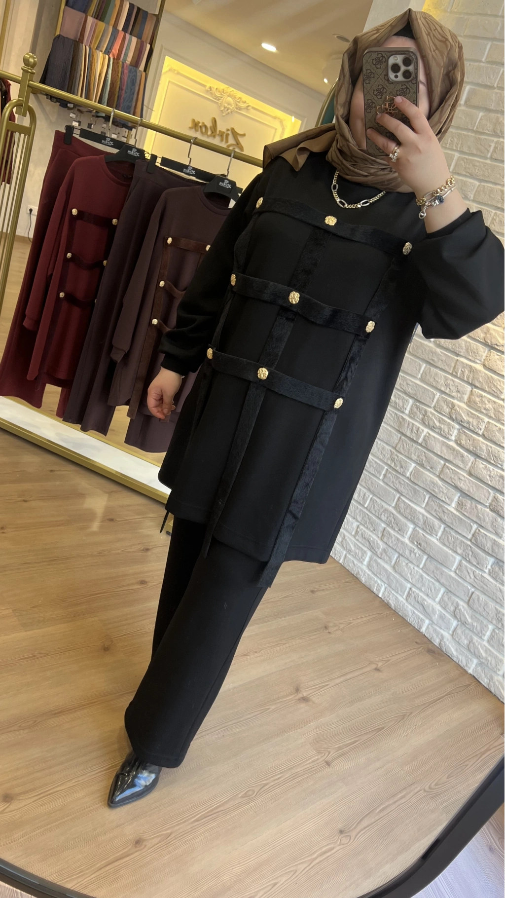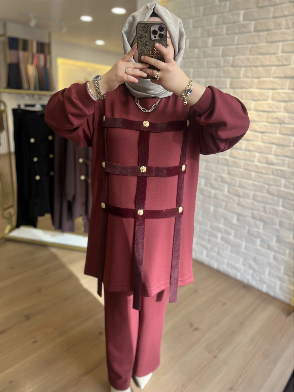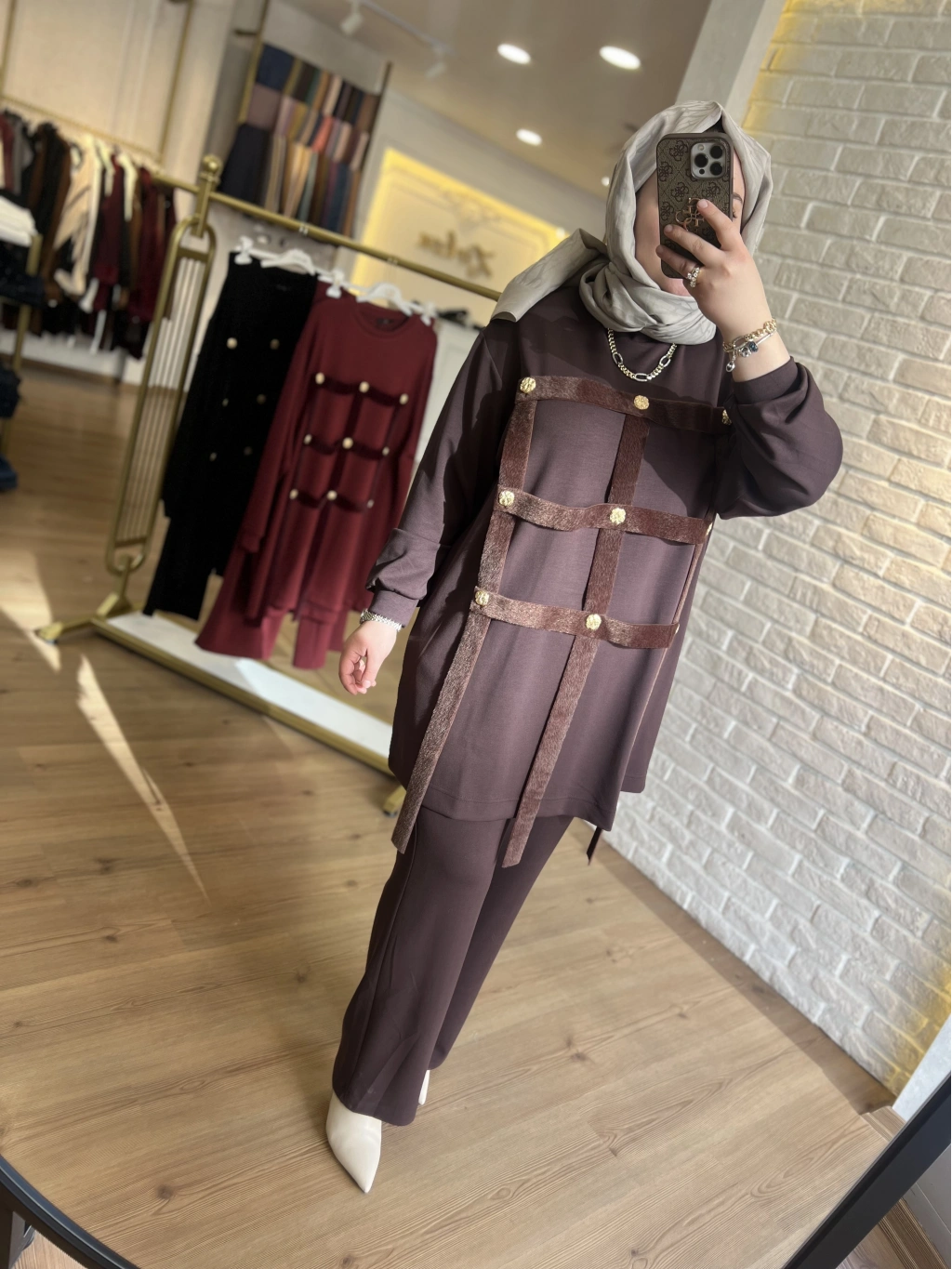 Pureva İncili Deri Detaylı Angora Yelekli Üçlü Takım