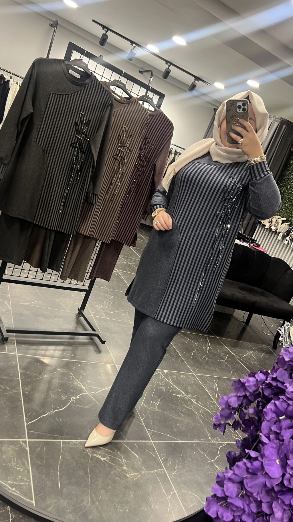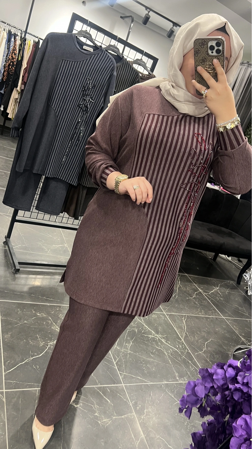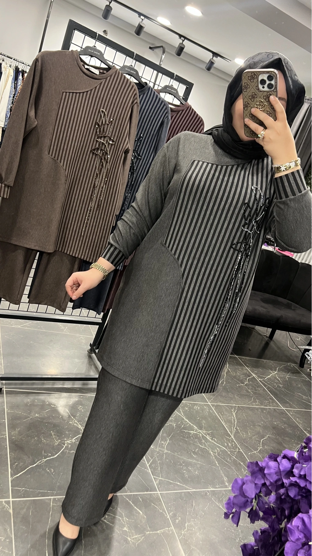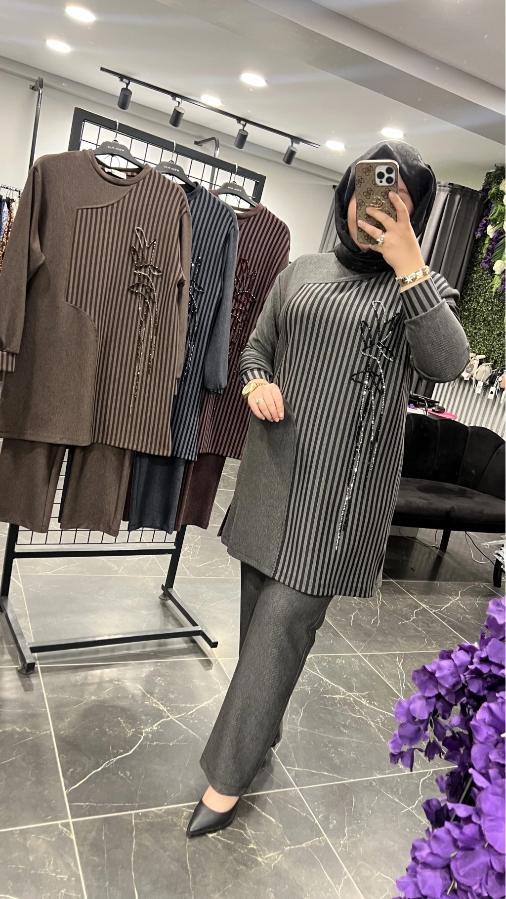 MEVA By Pureva Çizgili İşlemeli BÜYÜK BEDEN Takım