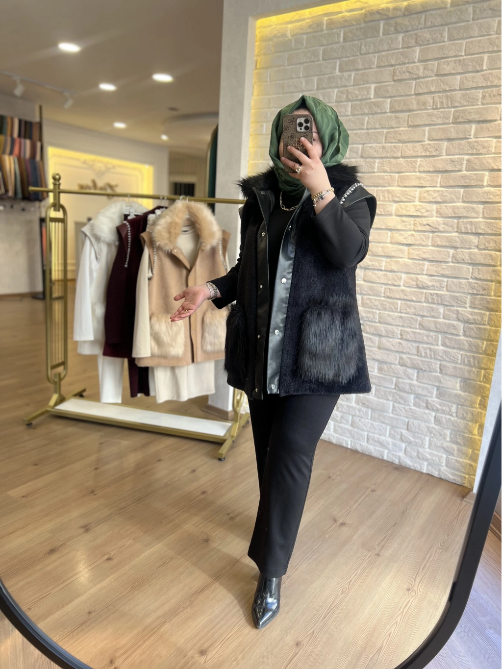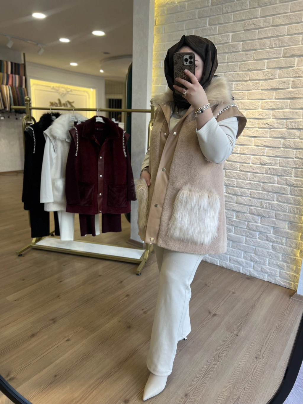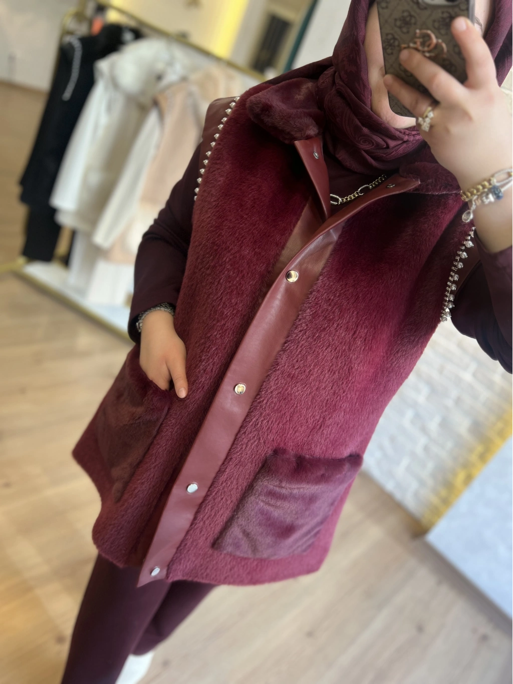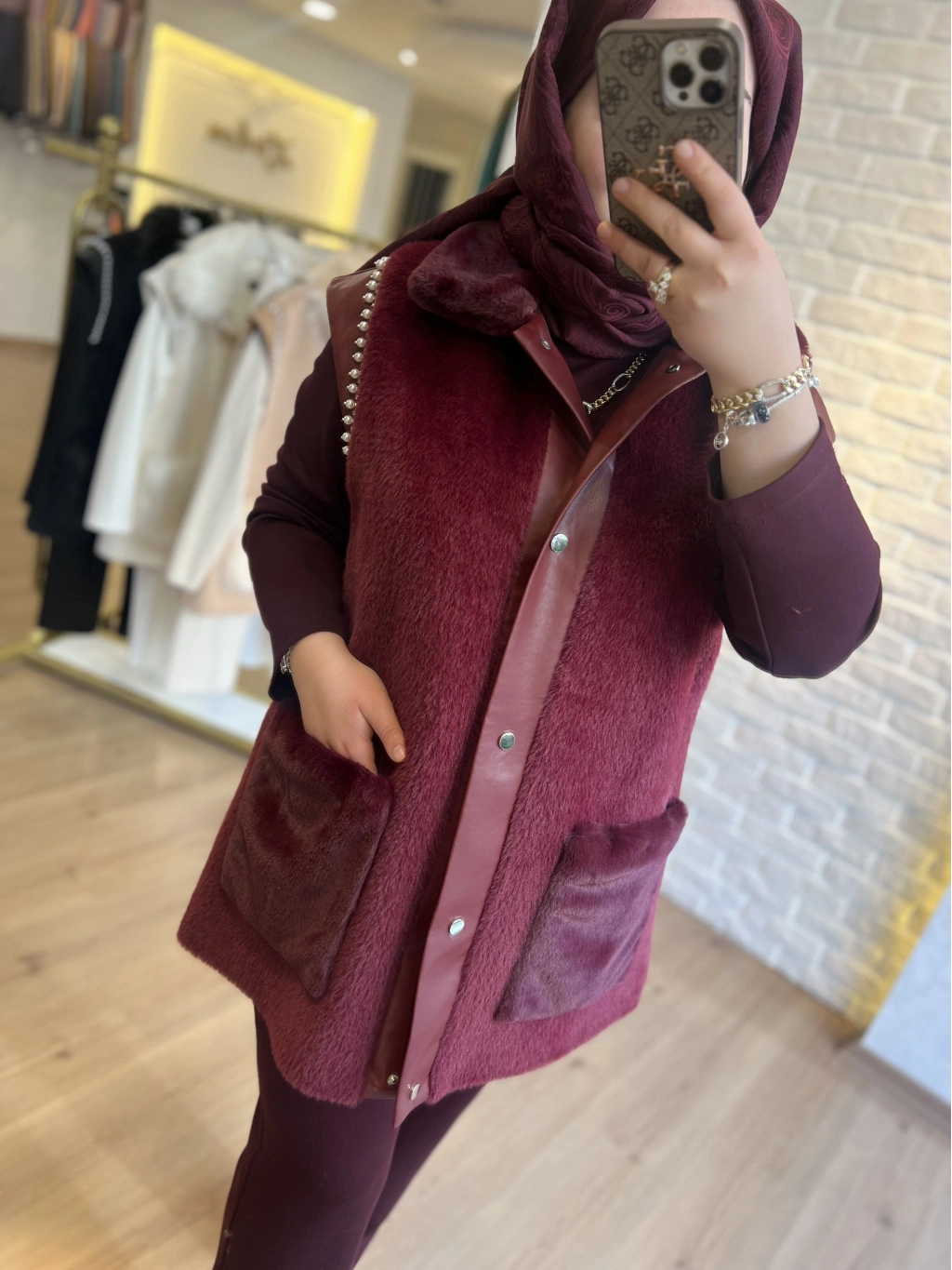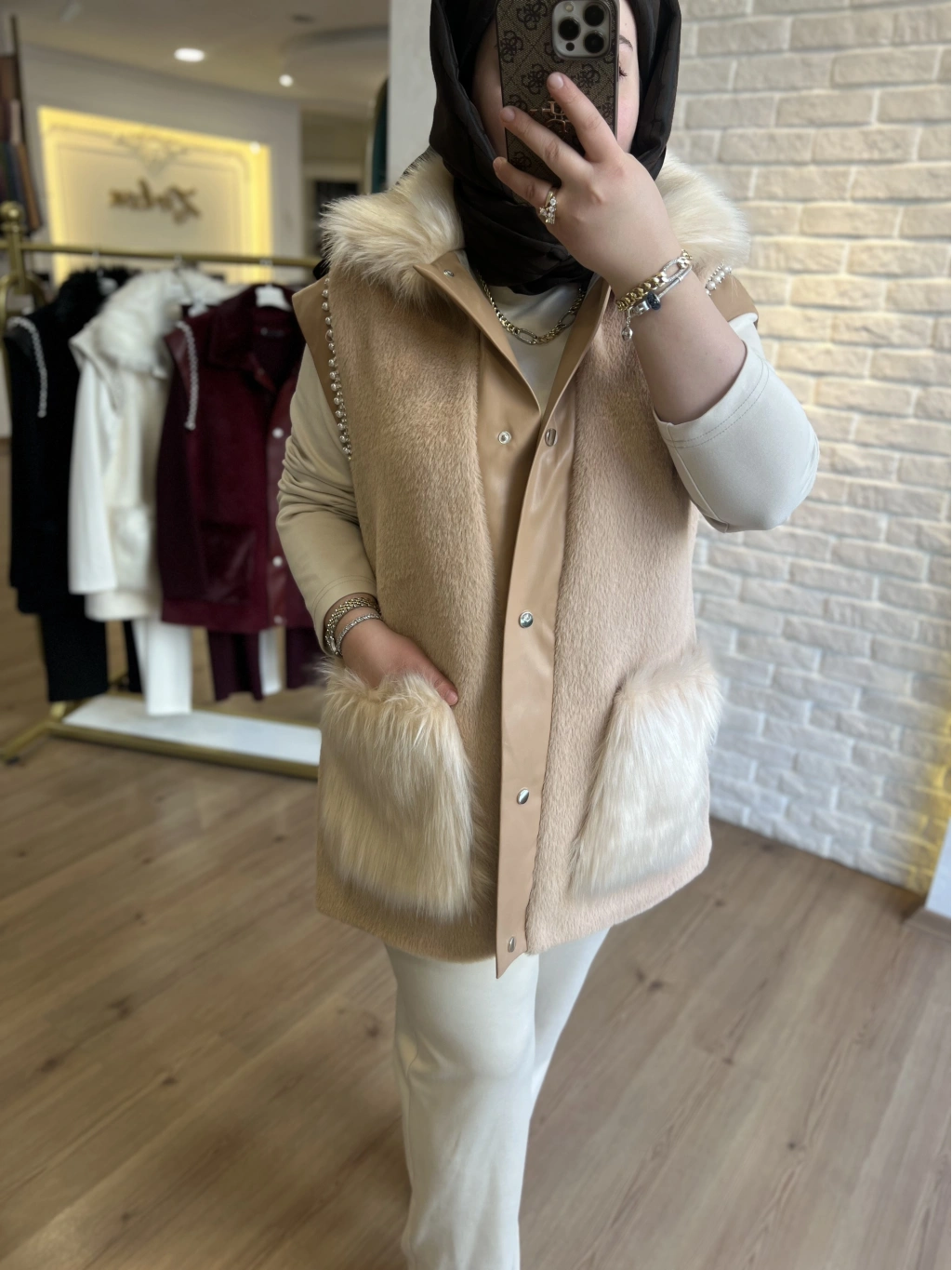 Pureva Deri ve Kuşgözü Detaylı Angora Üçlü Yelek Takım