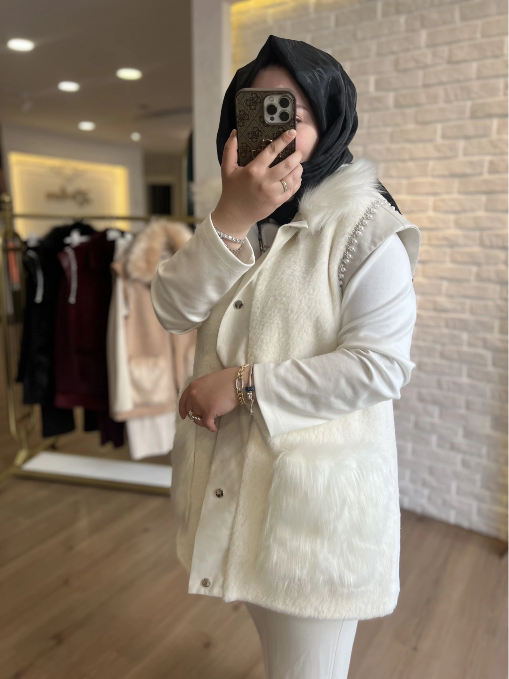 Pureva İncili Deri Detaylı Angora Yelekli Üçlü Takım